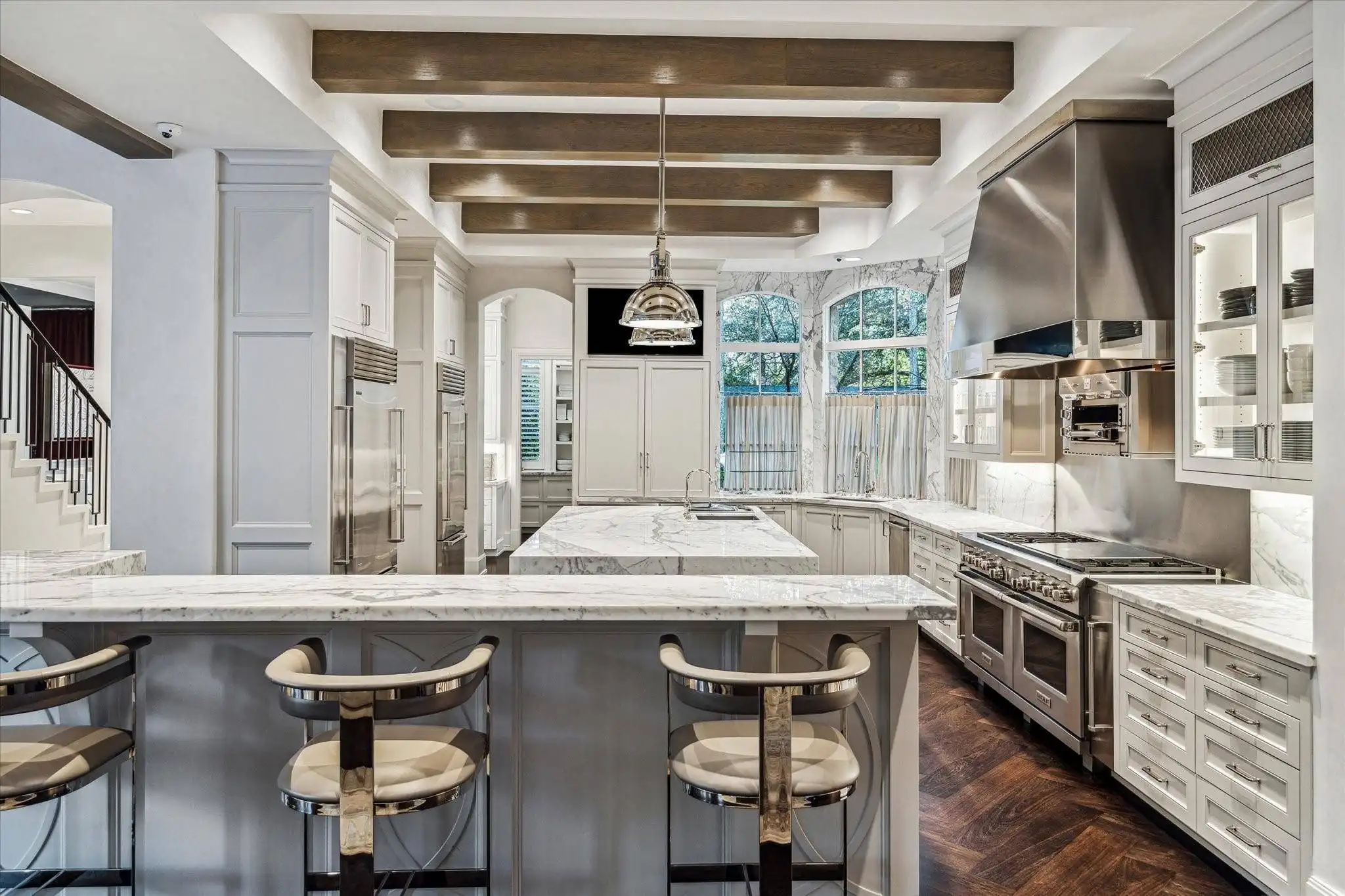 At 220 Merrie Way, the kitchen is alive with movement: the rhythmic chop of herbs, the soft clink of utensils, and the golden light catching polished marble countertops. The space feels like a stage for creativity, where cooking isn’t a chore but a craft. It’s the kind of kitchen that inspires experimentation, where every appliance is ready to turn an everyday dinner into a culinary experience.